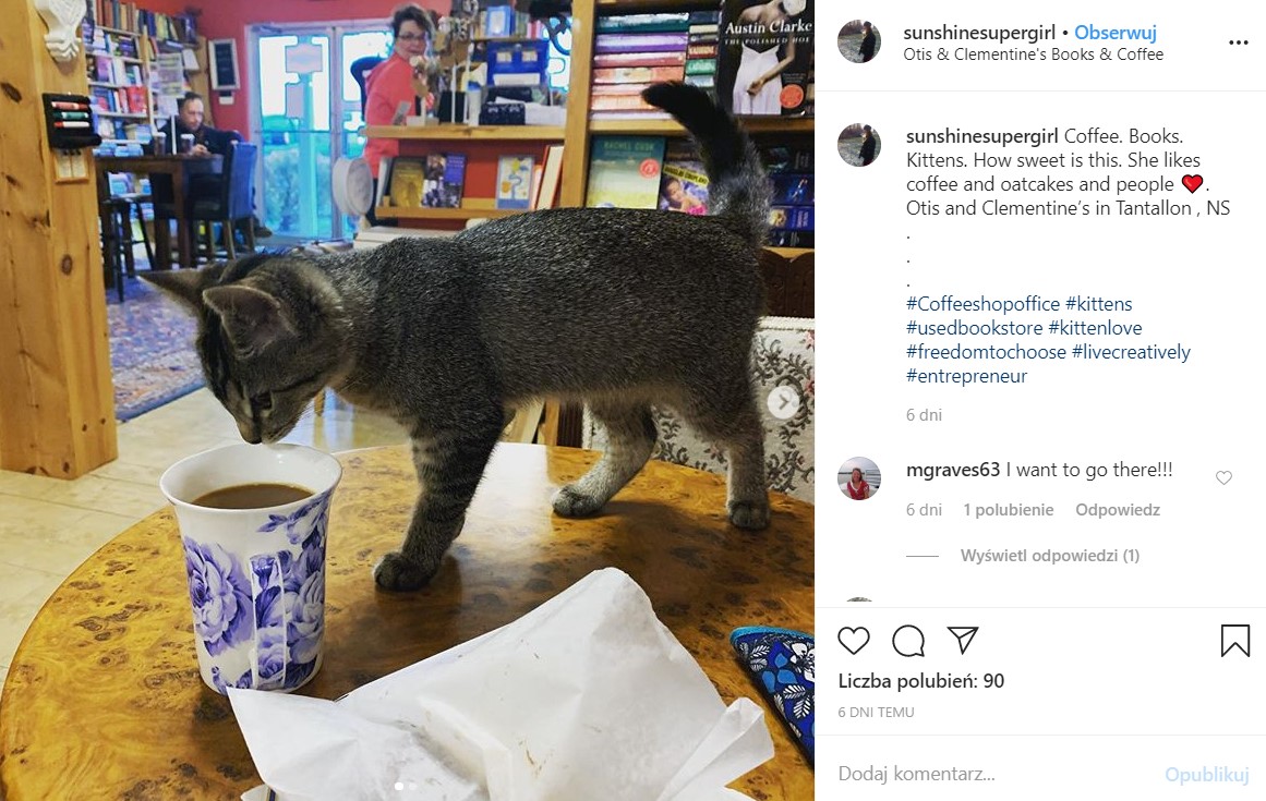 Teraz kawiarnia Otis & Clementine’s Books & Coffee współpracuje z kanadyjską organizacją Southpaw Conservation Nova Scotia, która zajmuje się pomaganiem zwierzętom. Do tej pory nowy dom udało się znaleźć już ponad 30 małym kotkom.