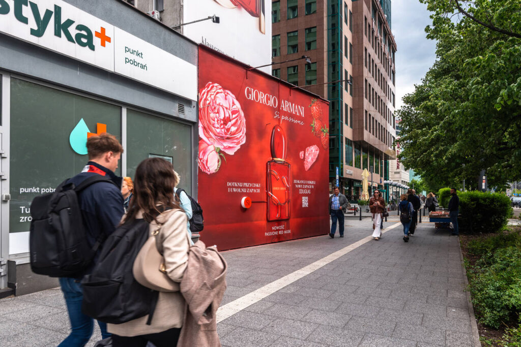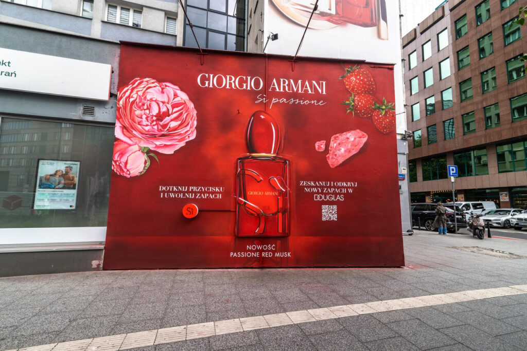 W Warszawie przy ul. Śliskiej 10 można poczuć zapach truskawek. To wszystko za sprawą pachnącego muralu, związanego z premierą zapachu Giorgio Armani „Si Passione Red Musk”.