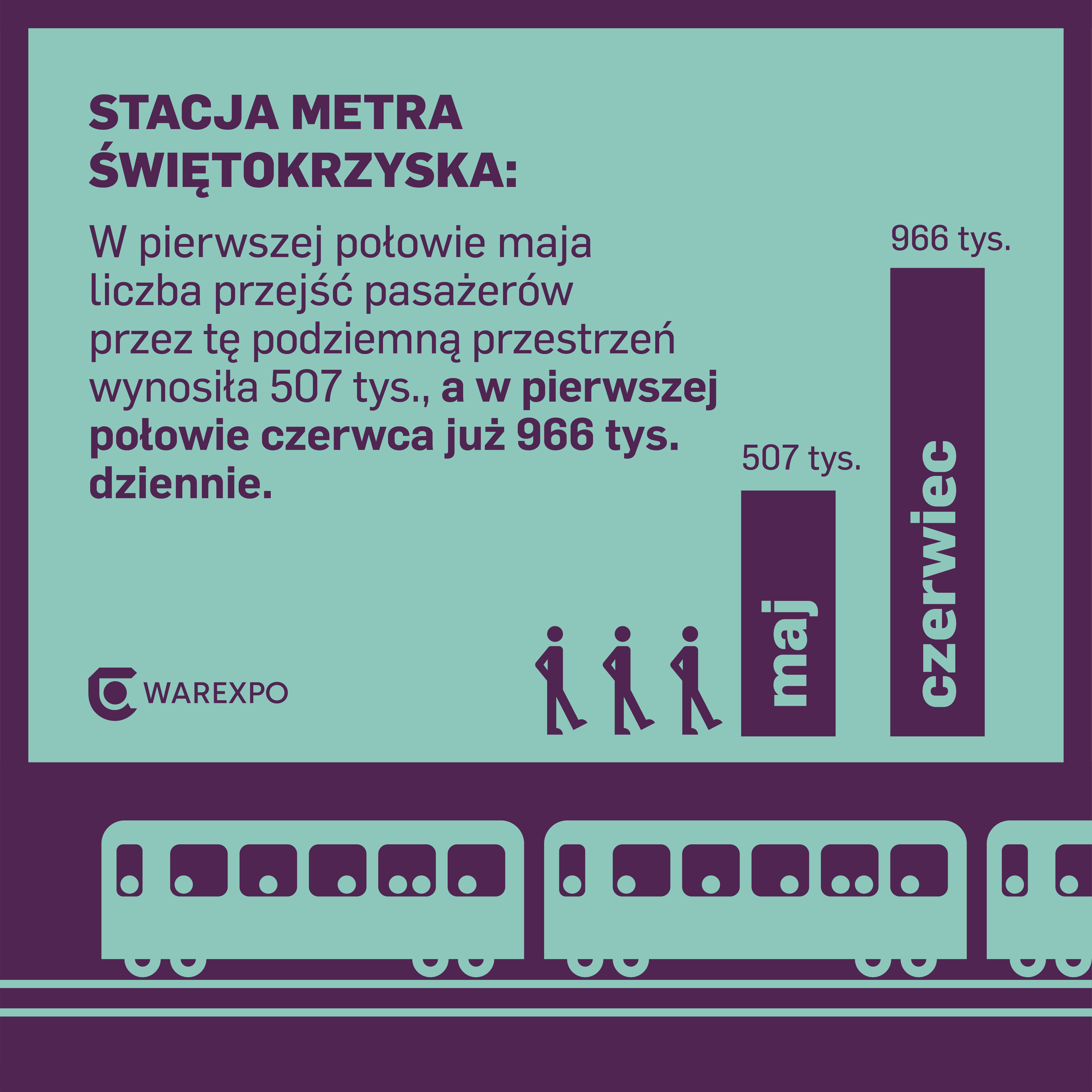 - Stacja Metra Świętokrzyska – trend wzmożonego ruchu jest widoczny również w metrze, na stacji przesiadkowej Metro Świętokrzyska. W pierwszej połowie maja liczba przejść pasażerów przez tę podziemną przestrzeń wynosiła 507 tys., a w pierwszej połowie czerwca już 966 tys. dziennie. Co stanowi niemal 90% wzrost.