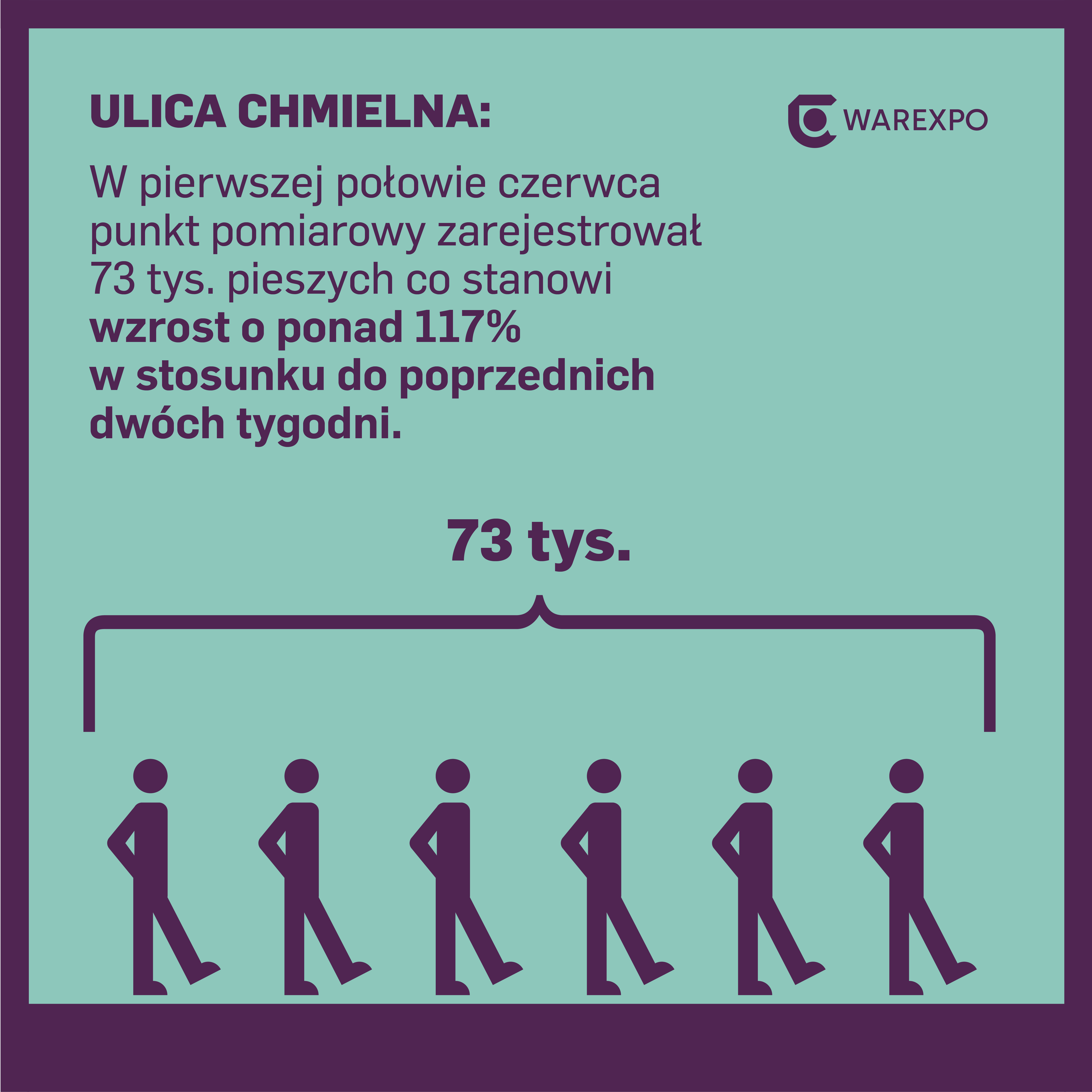 - ul. Chmielna – w pierwszych 2 tygodniach czerwca punkt pomiarowy zarejestrował 73 tys. pieszych poruszających się pomiędzy pasażem Wiecha, a ul. Zgody. Stanowi to wzrost o ponad 117% w stosunku do poprzednich dwóch tygodni. Dla porównania – w pierwszej połowie lutego punkt pomiarowy notował około 76 tys. przechodniów.