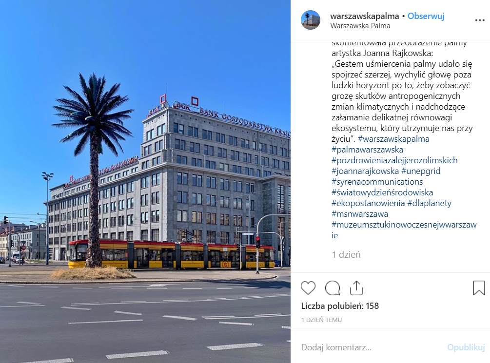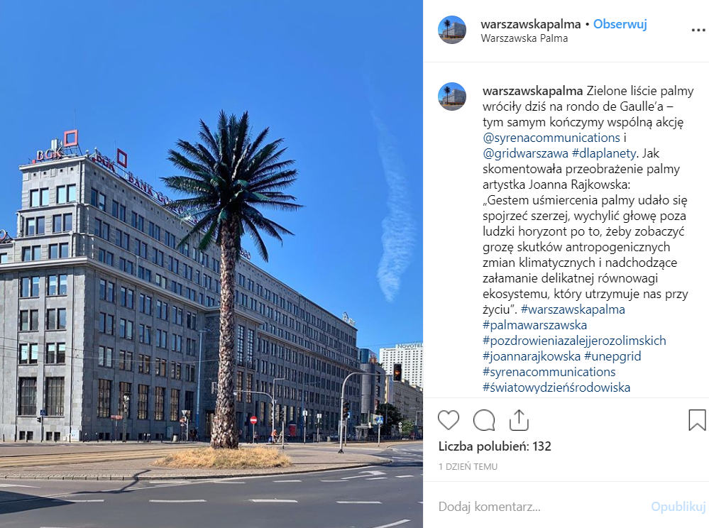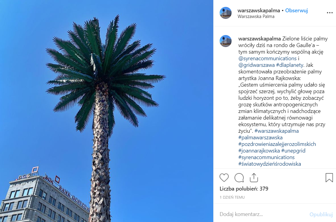 Na początku czerwca br. słynna warszawska palma zaczęła usychać. Był to element akcji z okazji tegorocznego Światowego Dnia Środowiska. W noc letniego przesilenia z 21 na 22 czerwca symbol stolicy znowu odżył – wszystko dzięki EKOpostanowieniom, czyli prostym, codziennym działaniom zapobiegających degradacji środowiska.