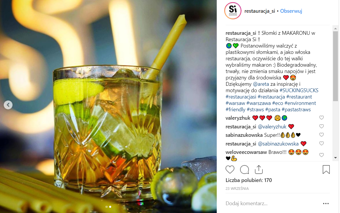 W walkę z plastikowymi słomkami angażuje się coraz więcej lokali gastronomicznych w Polsce, czego przykładem jest chociażby warszawska Restauracja Si. Zamiast jednorazowych, plastikowych słomek serwuje zamienniki w postaci makaronu!