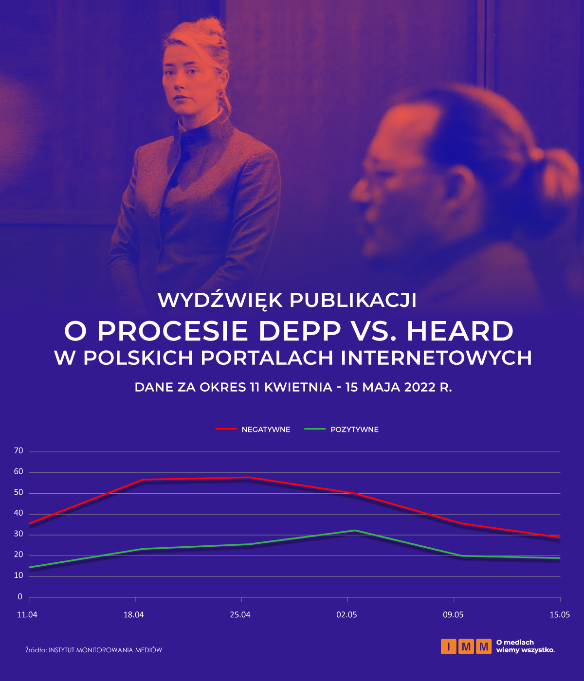 11 kwietnia tego roku rozpoczął się proces o zniesławienie, który Johnny Depp wytoczył swojej byłej żonie, twierdząc, że po jej oskarżeniach był zmuszony odejść z wielu planów filmowych. W okresie od 11 kwietnia do 15 maja br. tylko w portalach pojawiło się na ich temat już 1100 artykułów z dotarciem na poziomie 15 mln kontaktów z przekazem i wartością reklamową (AVE) o wysokości aż 9,2 mln zł. Mimo że nie jest to jedyny rozwód celebrytów z Hollywood, to ten po raz pierwszy cały świat może obserwować na żywo, prosto z sali rozpraw, co zdecydowanie wzbudza duże zainteresowanie mediów. Polscy widzowie mogą śledzić proces między innymi na kanale Law&Crime Network, dostępnym na YouTubie oraz na Tik Toku.