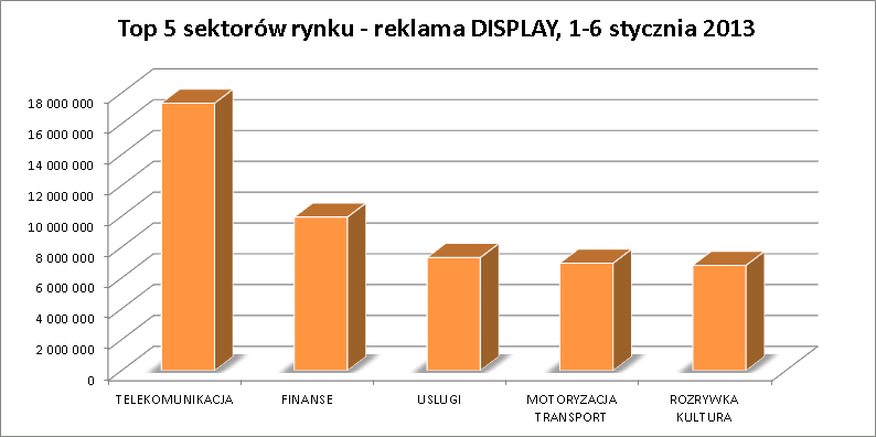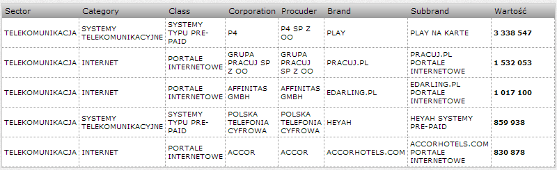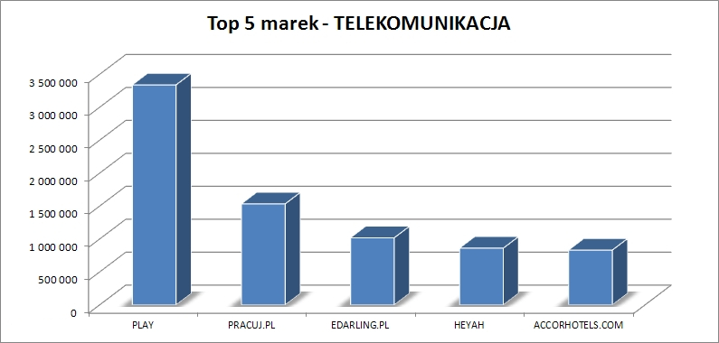 Sektorem o największych szacowanej wartości okazała się Telekomunikacja, z kwotą 17,3 mln zł. Wśród marek z tego sektora największą aktywnością wykazał się PLAY z szacowaną wartością 3,3 mln zł, wyprzedzając PRACUJ.PL, EDARLING.PL, HEYAH oraz ACCORHOTELS.COM.