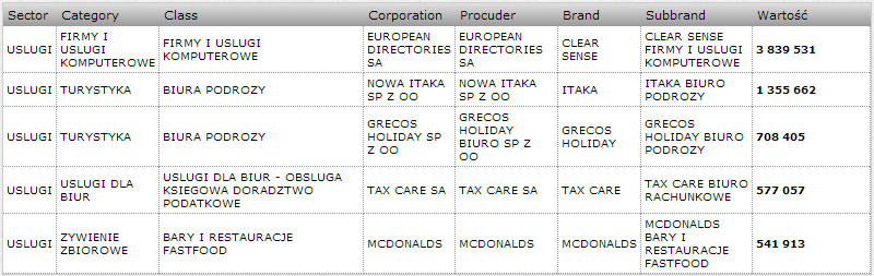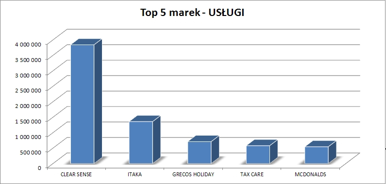 Trzecim sektorem pod względem wartości były Usługi – 7 mln zł. Dla tej kategorii marką o największym udziale wartości reklamy była CLEAR SENSE – 3,8 mln zł, następnie znalazły się ITAKA, GRECOS HOLIDAY, TAX CARE i MCDONALDS