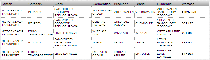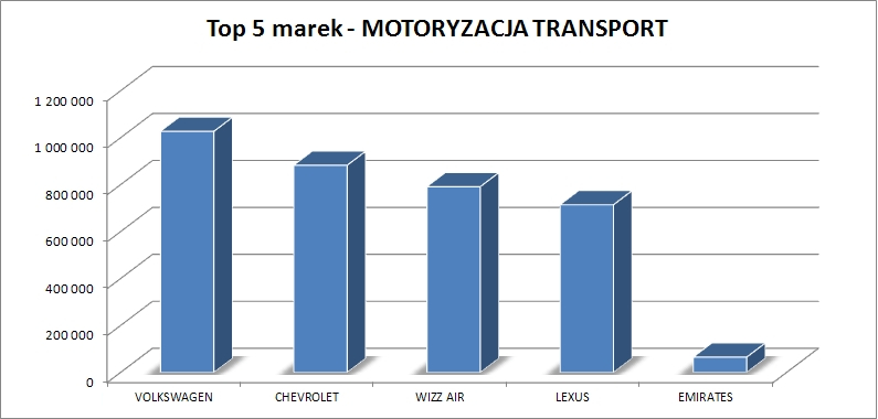 Kolejnym sektorem pod względem szacowanej wartości była Motoryzacja, Transport – 6,9 mln zł, najaktywniejszymi markami z tego sektora okazały się VOLKSWAGEN – 1 mln zł, następnie CHEVROLET, WIZZ AIR, LEXUS i EMIRATES.