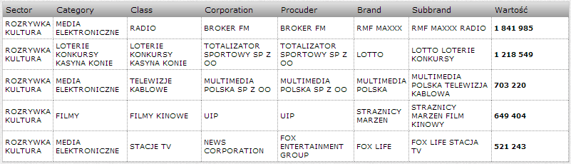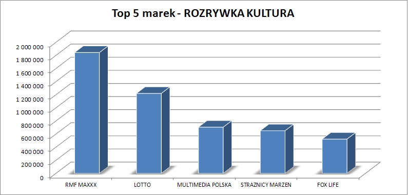 Na piątym miejscu znalazła się Rozrywka Kultura z szacowaną wartością 6,8 mln zł. RMF MAXXX z wartością 1,8 mln zł był marką o największym udziale dla tej kategorii, na kolejnych miejscach znalazły się: LOTTO, MULTIMEDIA POLSKA, STRAZNICY MARZEN oraz FOX LIFE.