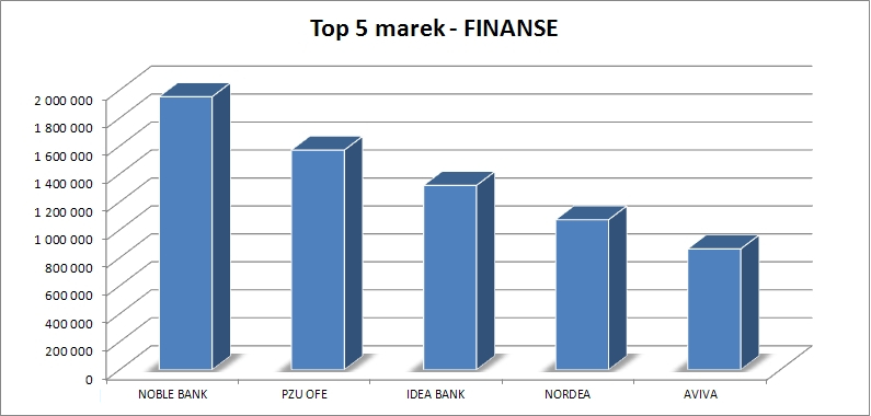 Na drugim miejscu znalazły się Finanse z wartością 9,9 mln zł. Najbardziej zaangażowaną marką z tego sektora był NOBLE BANK – 1,9 mln zł, za nim kolejno znalazły się PZU OFE, IDEA BANK, NORDEA i AVIVA.