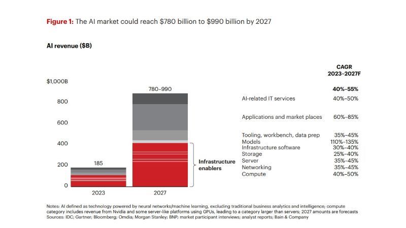 Eksperci Bain szacują, że liczba zadań wykonywanych przez AI będzie rosła 25-35 proc. rocznie do 2027 roku, co spowoduje znaczne zwiększenie popytu na sprzęt i oprogramowanie z tym związane. Przełoży się to na radykalne zwiększenie skali działania centrów danych w najbliższych 5-10 latach. Ich średnia moc wzrośnie z obecnych 50-200 MW do powyżej 1 GW.