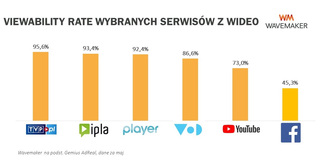 Statystyki Gemius AdReal bazują na liberalnej definicji viewability wypracowanej przez IAB – zakłada ona, że wideo musi się znajdować w polu widzenia użytkownika na minimum 50 proc. okna playera przynajmniej przez 2 konsekutywne sekundy. Przypomnijmy, że GroupM (Wavemaker jest jej częścią) promuje znacznie bardziej wymagający i korzystny dla marketerów standard, zgodnie z którym wideo musi trafić do prawdziwego użytkownika i zostać odtworzone przez niego z dźwiękiem w przynajmniej 50 proc. długości, pole reklamy musi zaś być widoczne w całości.