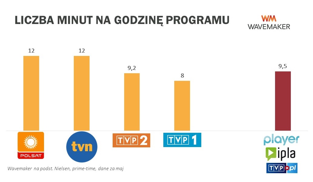Oznacza to, że obłożenie reklamowe w VOD zbliża się już do tego telewizyjnego. Wypełnienie ustawowego limitu reklamowego na antenach głównych nadawców komercyjnych sięga 100 proc., a więc 12 minut na godzinę. Niższe jest w TVP1 i TVP2, które nie mogą tak swobodnie zarządzać swoim czasem i przerywać programów telewizyjnych reklamami – ich nadawca robi to jednak swoim serwisie TVP.pl.