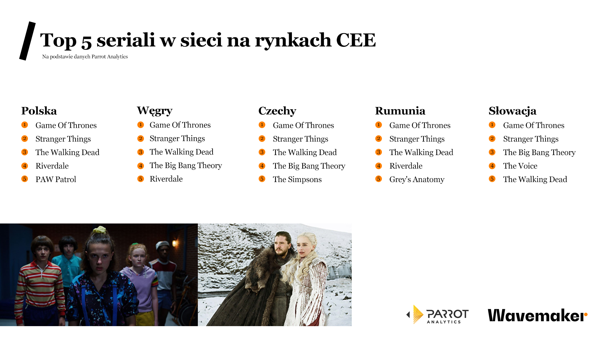 Jak pokazują dane Parrot Analytics, w 2019 roku Polaków, Czechów, Węgrów, Słowaków i Rumunów najbardziej rozgrzały w internecie „Gra o tron” oraz „Stranger Things” – nowe serie tych produkcji osiągnęły najwyższy wskaźnik demand expressions*.