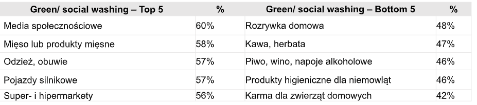 Zdaniem konsumentów kategorie wypadające pod tym względem najgorzej to media społecznościowe (60%), mięso i produkty mięsne (58%) oraz odzież i obuwie (57%).