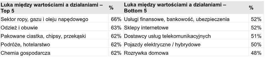 Z opublikowanej analizy wynika, że nadal istnieje dysonans między intencjami konsumentów a ich zachowaniami w sferze zrównoważonego rozwoju – jest to tzw. luka między wyznawanymi wartościami a ich praktyczną realizacją. Największa rozbieżność występuje w przypadku sektora ropy, gazu i oleju napędowego (66%) oraz odzieży i obuwia (63%). Sektory wypadające najlepiej pod tym względem to rozrywka domowa (48%) i pojazdy elektryczne (50%).