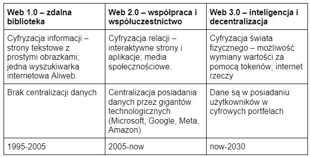 W 1993 r. powstała pierwsza wyszukiwarka. Mało kto wie, że nie był to Google, a Aliweb. To również początek ery web 1.0, gdzie dokonano cyfryzacji informacji, a dane nie były w posiadaniu dużych graczy. W kolejnej generacji, w której trwamy obecnie, cyfryzacji uległy nasze relacje. To również czas twórców internetowych, którzy mają większy wpływ na odbiorców, niż chociażby reklama telewizyjna. W Web 3.0 digitalizacji ulegną rzeczy materialne, nasz świat fizyczny. Zmieni się też prawo własności, wytwarzane treści czy dzieła będą należały bezpośrednio do twórców, a nie jak jest obecnie w większości przypadków – dystrybutorów.