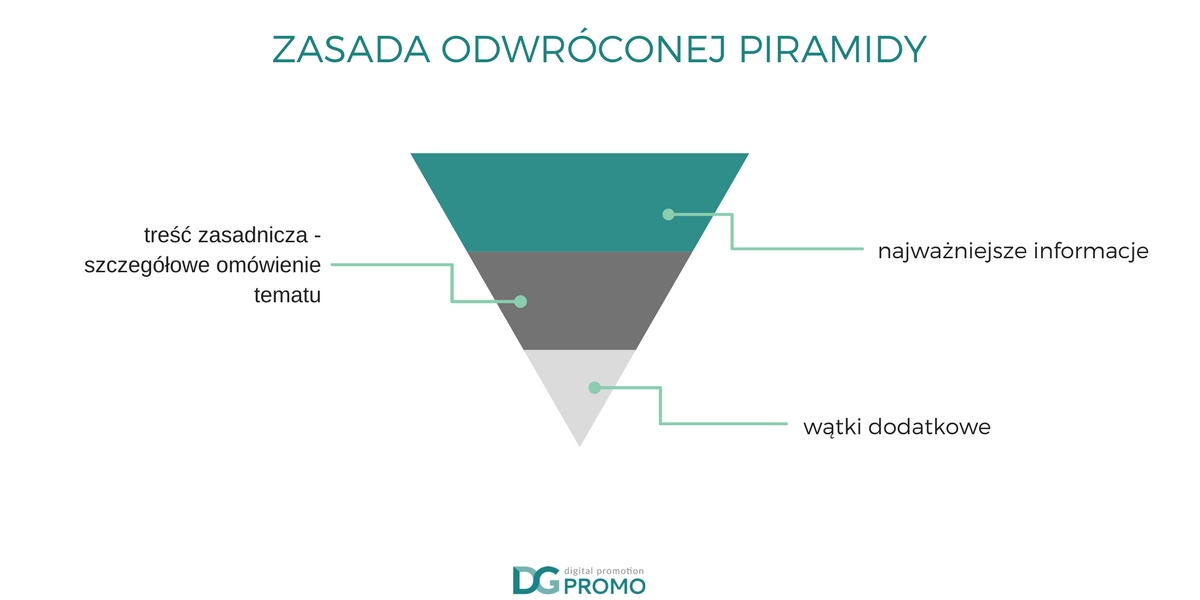 Zanim przystąpimy do pisania, musimy stworzyć plan i odpowiednio pogrupować wiadomości. Te, na których przede wszystkim nam zależy, trzeba umieścić w górnej części tekstu, zachowując przy tym intrygującą i angażującą odbiorcę formę. Gdy czytelnik zwróci na nie uwagę, to prawdopodobieństwo tego, że zdecyduje się przeczytać resztę tekstu, zdecydowanie wzrasta. To właśnie zasada odwróconej piramidy.