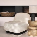 Przytulny kącik do pracy w salonie: kojące kolory i organiczne kształty mebli, pozytywnie wpłyną na nastrój.