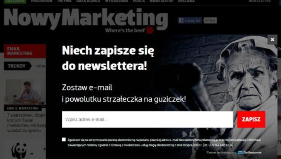 Można to też zrobić w bardziej zabawny sposób. Nietypowy pomysł na zachęcenie czytelników do zapisania się do newslettera zastosowano na stronie nowymarketing.pl: