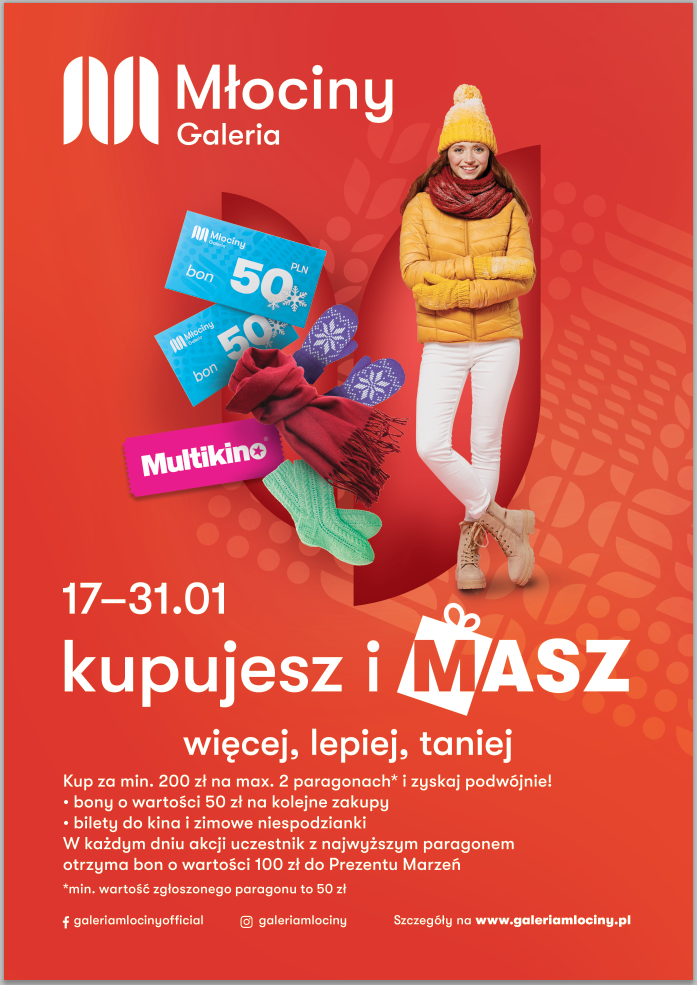 Już od 17 do 31 stycznia klienci Galerii Młociny będą mieli okazję, by wziąć udział w pierwszej w nowym roku akcji Kupujesz i Masz. Również tym razem zasady akcji promocyjnej będą bardzo atrakcyjne, ponieważ odwiedzający, którzy w podanym terminie zrobią zakupy za minimum 200 zł (zebrane na maksymalnie 2 paragonach), otrzymają bon o wartości 50 zł na kolejne zakupy! Co ciekawe, obiekt rozda aż 1000 voucherów! Wśród nagród znajdziemy również bilety do Multikina i liczne upominki. Dodatkowo każdego dnia 1 osoba, która zarejestruje paragon najwyższej wartości, otrzyma voucher do Prezentu Marzeń o wartości 100 zł. Dowody zakupu niezmiennie należy rejestrować na stoisku znajdującym się na poziomie 1, tuż obok sklepu Gagliardi.