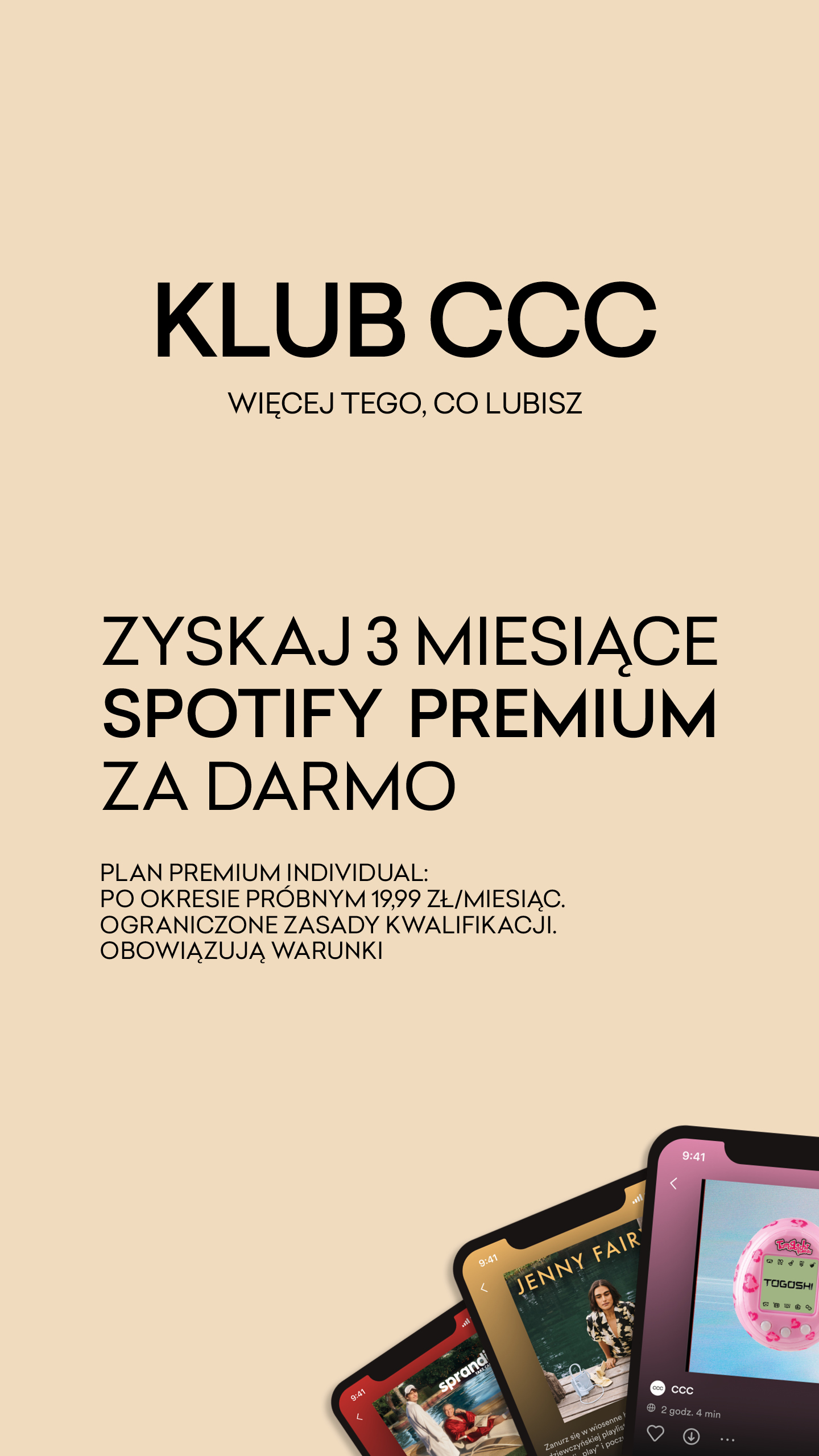 Najpopularniejsza platforma streamingowa Spotify dołączyła do grona Partnerów Klubu CCC. W ramach specjalnej oferty, Klubowicze o statusach Silver i Gold otrzymają w prezencie 3-miesięczny bezpłatny dostęp do konta Spotify Premium bez żadnych ograniczeń. Dla nowych członków klubu CCC także przewidziano atrakcje i bezpłatny, dwumiesięczny dostęp do platformy muzycznej. Dołącz do Klubu CCC, skorzystaj z oferty i ciesz się towarzystwem ulubionej muzyki i podcastów.