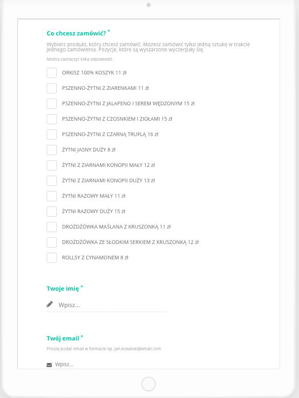Prosty formularz zamówień online, który wyślesz do klientów, opublikujesz na swoich social mediach czy stronie internetowej, pozwoli Ci realizować codzienne zamówienia tak, jak dotychczas. Plusów takie rozwiązania jest naprawde wiele – utrzymujesz kontakt z klientami, możesz przygotować się na codzienne zamówienia oraz ułożyć strategię działania firmy na najbliższe tygodnie, czy nawet miesiące.