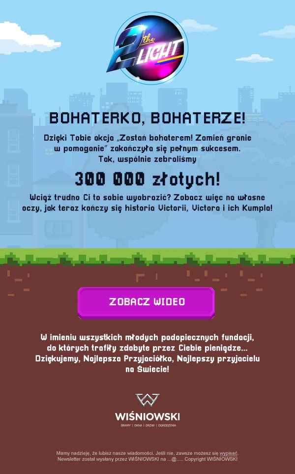 Charytatywna gra 2 THE LIGHT, czyli akcja CSR firmy WIŚNIOWSKI okazała się ogromnym sukcesem! Udało się osiągnąć założony cel, czyli zebrać 300 000 monet, które zostaną zamienione na prawdziwe pieniądze i trafią do podopiecznych trzech fundacji.