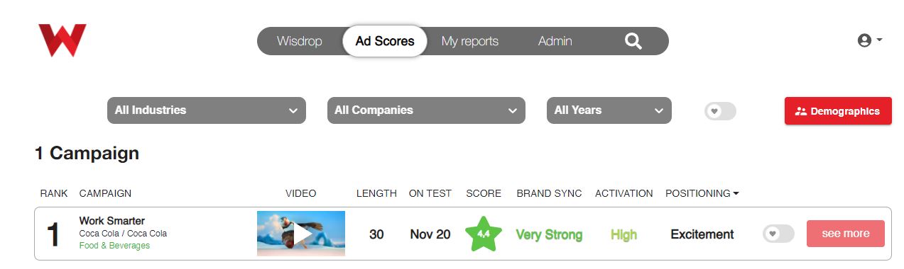W drugiej sekcji zatytułowanej Ad Scores prezentowane są rankingi kampanii reklamowych z ostatniego kwartału, oceniane przez specjalistów z Braincandy.