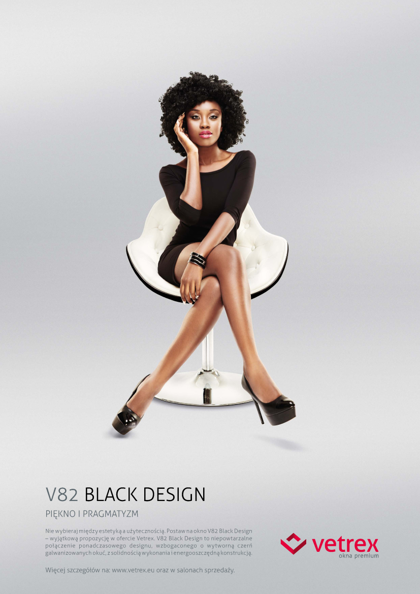 Najnowsza kampania reklamowa dla firmy Vetrex skupia się na systemie V82 Black Design, które jako drugie w portfolio Vetrex posiada galwanizowane okucia w czarnym kolorze. Vetrex jest jedynym polskim producentem okien posiadającym w swojej ofercie tak unikalne pod względem estetyki produkty. „V82 Black Design to wybór dla tych klientów, którzy nie chcą iść na kompromis między wysoką jakością wykonania okien, ich energooszczędnością a oryginalnym designem”– podkreśla Wiceprezes Zarządu Vetrex, Daniel Malinowski – „Z tych właśnie powodów zrodziła się potrzeba stworzenia mocnej i wyrazistej kreacji, której charakter odpowiadałby unikalnym walorom okna V82 Black Design”.