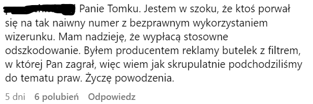 Internauci prześcigali się w domysłach, w jaki sposób doszło do wykorzystania wizerunku Tomasza Kota i jaką rolę w całej sytuacji odegrał na przykład agent aktora lub reprezentująca go agencja. Nie brakowało też komentarzy dotyczących ewentualnego odszkodowania, które aktor miałby otrzymać po wygraniu batalii sądowej z producentami napoju.