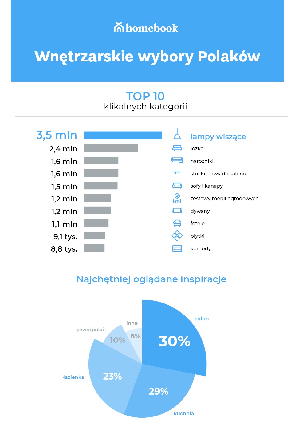Obecna ścieżka zakupowa klientów, którzy zastanawiają się nad urządzaniem konkretnego pomieszczenia, rozpoczyna się od przeglądania inspiracji dostępnych w sieci. Dopiero na podstawie wybranych aranżacji podejmowana jest decyzja o zakupie produktów w wybranym stylu. Według danych Homebook.pl, platformy gromadzącej niemal 700 tysięcy zdjęć pomieszczeń, wynika, że użytkownicy w 2019 roku najczęściej poszukiwali w sieci pomysłów na urządzenie salonu (30% odsłon wszystkich zdjęć inspiracyjnych platformy).
