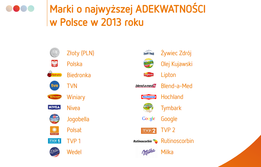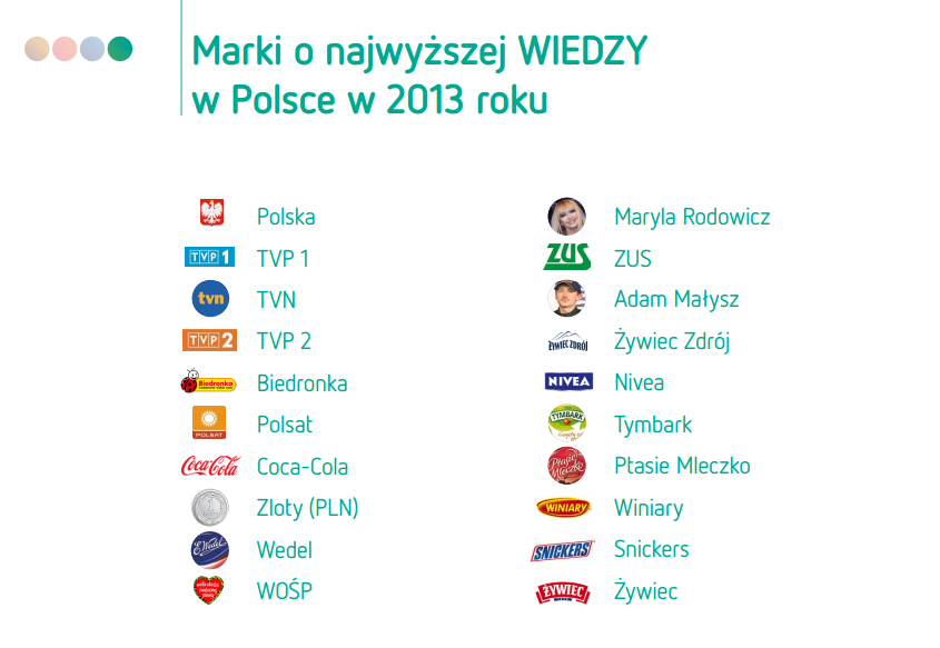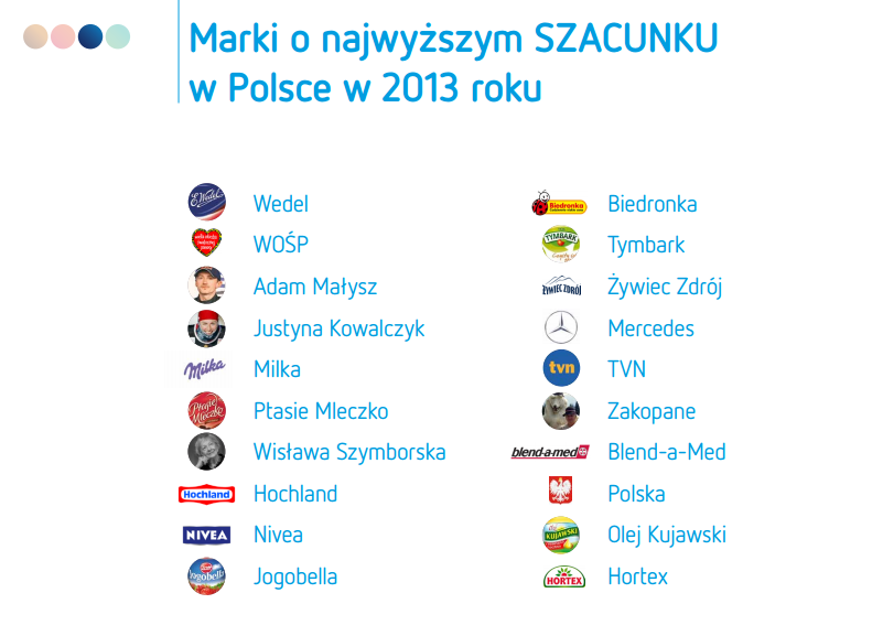 Marki o najwyższej wyróżnialności w Polsce w 2013 r. to kolejno: Rafaello, Wielka Orkiestra Świątecznej Pomocy oraz National Geographic. Wśród brandów najwyższej adekwatności (czyli dopasowaniu do potrzeb konsumentów) przewodzą: Polski Złoty, Polska (kraj) oraz sieć sklepów Biedronka. Z kolei najwyższym szacunkiem cieszą się: Wedel, Wielka Orkiestra Świątecznej Pomocy i, mimo zakończenia kariery skoczka narciarskiego, Adam Małysz. Markami, o których Polacy w 2013 r. mają największą wiedzę, są: Polska (kraj), TVP 1 i TVN.