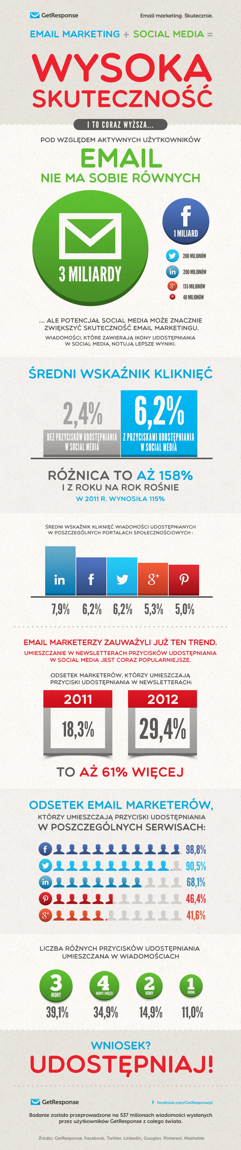 “W porównaniu z badaniem z ubiegłego roku, liczba marketerów stosujących integrację kampanii email marketingowych z najpopularniejszymi portalami społecznościowymi wzrosła aż o 61%. Jest to jasny sygnał, że umieszczanie w newsletterach przycisków udostępniania w social media to nie była tylko chwilowa moda, wynikająca z ogromnej popularności portali społecznościowych, ale trend, który może zwiększać skuteczność kampanii email marketingowych.” – komentuje wyniki badania Maciej Ossowski, dyrektor Działu Edukacji w GetResponse.