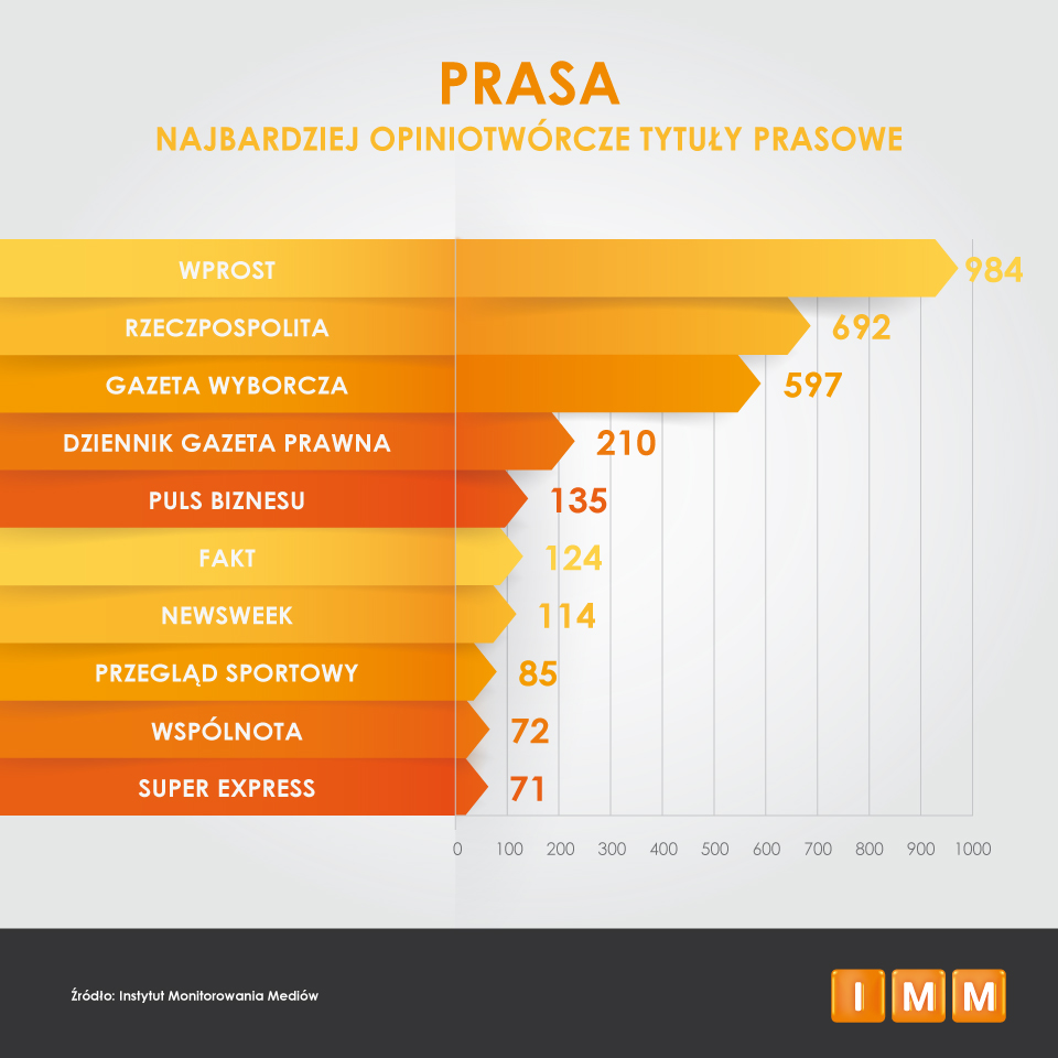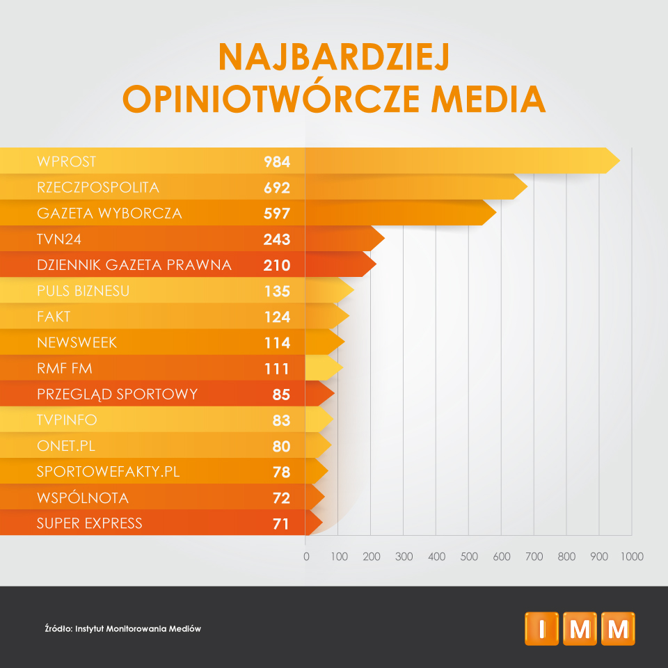 W rankingu najczęściej cytowanych mediów pierwsze miejsce zajął tygodnik Wprost. Na drugiej pozycji znalazła się Rzeczpospolita, na trzeciej – Gazeta Wyborcza.