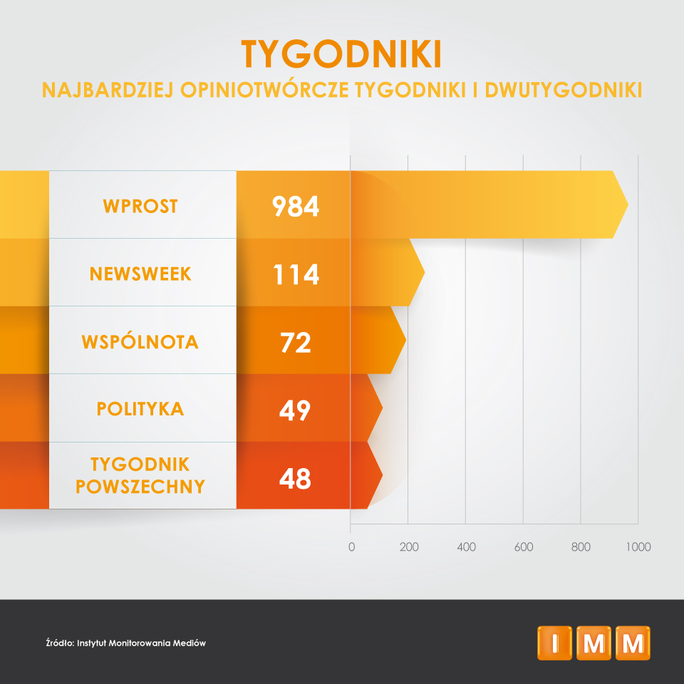 Wśród najczęściej cytowanych tygodników i dwutygodników pierwsze miejsce zajął Wprost. Natomiast miesięcznikiem, na który najczęściej powoływały się inne media był Forbes.