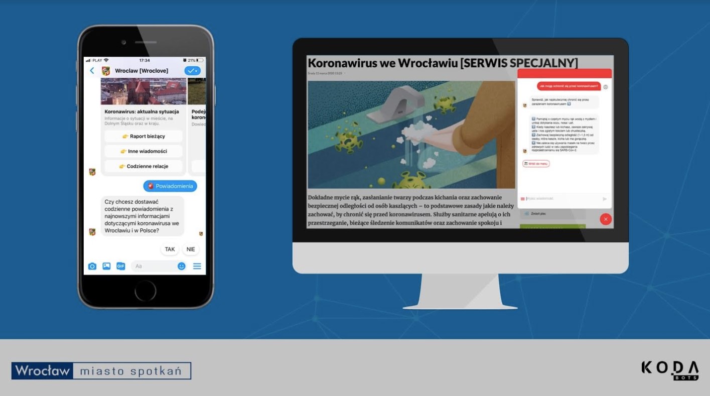 Chatbot Urzędu Miejskiego Wrocławia pracuje całodobowo. Znajduje się w specjalnym serwisie portalu www.wroclaw.pl poświęconemu koronawirusowi i fanpage’u Wroclaw [Wroclove]. To pierwszy w Polsce wirtualny, samorządowy doradca, który porusza tak szeroko temat epidemii. Użytkownik może dzięki niemu sprawdzić bieżące informacje na temat koronawirusa i zapisać się na codzienne powiadomienia.