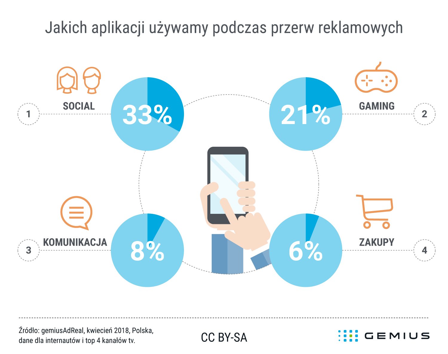 Analizę zachowań konsumentów przed telewizorem Gemius pogłębił o zbadanie tego, co internauci robili w sieci w trakcie przerw reklamowych. Okazuje się, że najczęściej przeglądali aplikacje społecznościowe (33 proc.). Ponad jedna piąta konsumentów grała w tym czasie w gry na smartfonie (21 proc.). W dalszej kolejności wykorzystywane były aplikacje do komunikacji, w tym tradycyjne rozmowy przez telefon (8 proc.) oraz aplikacje służące do robienia zakupów online (6 proc.).
