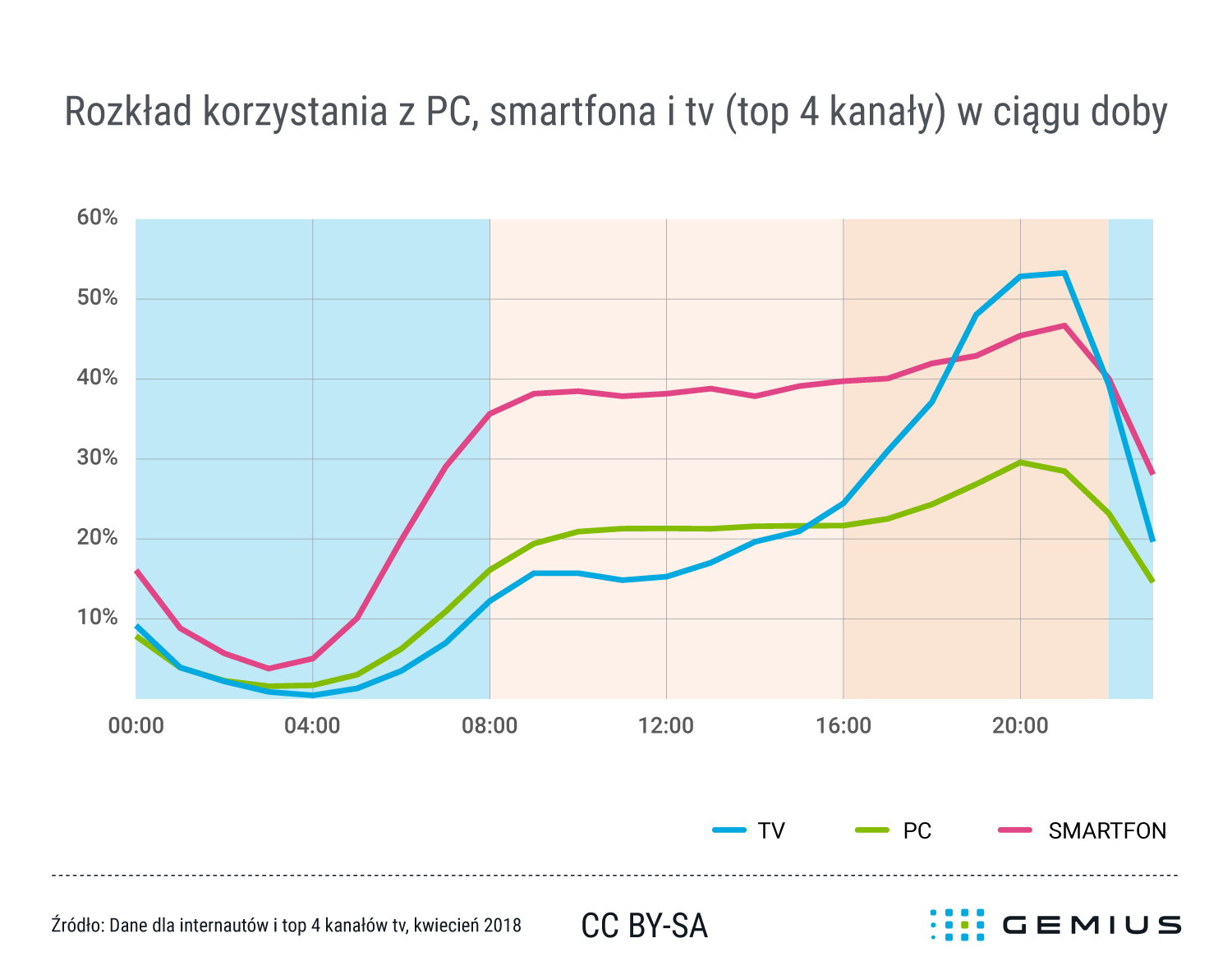 Z danych wynika, że w ciągu doby występowały istotne współzależności pomiędzy korzystaniem z komputerów osobistych, laptopów, smartfonów i telewizorów. Okazuje się, że smartfon towarzyszył internautom od świtu do nocy – aktywność użytkowników korzystających z tego urządzenia wzrastała stopniowo od wczesnych godziny porannych aż do wieczora, gdzie między godziną 20 a 21 osiągnęła szczyt (źródło: dane dla internautów i top 4 kanałów tv, kwiecień 2018). Podobny rozkład godzinowy konsumowania treści zaobserwowano także wśród internautów, którzy łączyli się z siecią za pomocą komputerów osobistych i laptopów, natomiast pozostawał on na niemal dwukrotnie niższym poziomie. Dużo bardziej zróżnicowany był jednak dzienny rozkład oglądania telewizji (badanie objęło cztery najbardziej liczące się na rynku kanały tv: Polsat, TVN, TVP1 i TVP2). Do godziny 15 konsumpcja tego medium znajdowała się na najniższym poziomie pośród badanych urządzeń, natomiast od godziny 16 zaobserwowano gwałtowny wzrost.