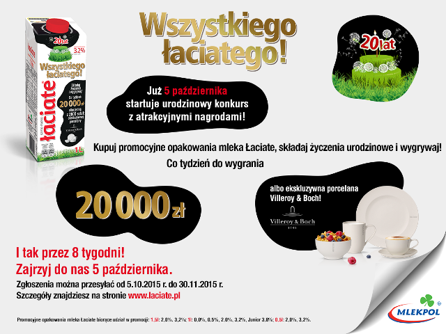 Spółdzielnia Mleczarska „MLEKPOL” z okazji 20 – lecia marki ŁACIATE nagrodzi najwierniejszych konsumentów, którzy wezmą udział w konkursie. 5 października w telewizji, radiu, Internecie i na nośnikach reklamy zewnętrznej ruszy ogólnopolska kampania informacyjno-reklamowa „Wszystkiego ŁACIATEGO” promująca konkurs zorganizowany przez producenta z Grajewa. Do 30 listopada można wysyłać życzenia ŁACIATEMU. Co tydzień będą wybierane najciekawsze z nich i nagradzane. Szczegóły i regulamin konkursu – na stronie www.laciate.pl