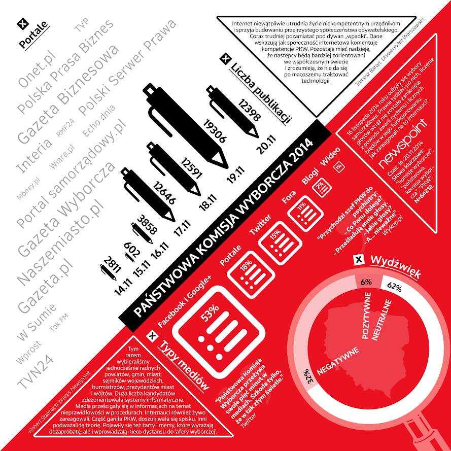Wybieraliśmy jednocześnie radnych powiatów, gmin, miast, sejmików wojewódzkich, burmistrzów, prezydentów miast oraz wójtów. Tak duża liczba kandydatów zdezorientowała nie tylko wyborców ale także systemy informatyczne. Głosy były liczone ręcznie a media prześcigały się w informacjach na temat nieprawidłowości w procedurach. Najczęściej krytykowały Państwową Komisję Wyborczą za brak organizacji i niefrasobliwość. Do tego chóru dołączyła część polityków. Internauci również żywo zareagowali na sytuację. Ganili PKW, doszukiwali się spisku, oskarżali partie o manipulacje. Na drugim biegunie znalazły się głosy w obronie demokracji, podważające teorie spiskowe.