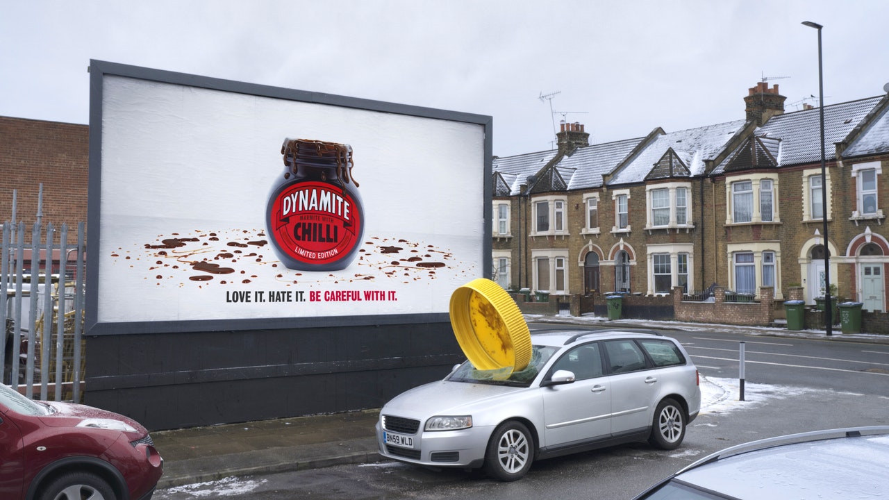 W ramach promocji w Wielkiej Brytanii pojawił się billboard przedstawiający krem Marmite Dynamite z hasłem „Love It. Hate It. Be Careful With It”. Aby podkreślić „żywiołowy” i „wybuchowy” smak smarowidła, gigantyczna nakrętka od produktu dosłownie wyleciała w powietrze i wpadła na przednią szybę pobliskiego samochodu.