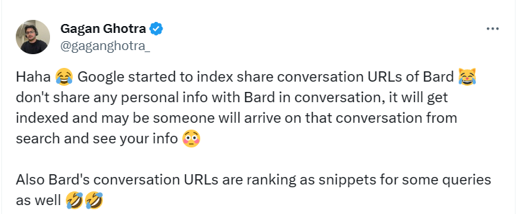 – Google zaczęło indeksować udostępnianie adresów URL konwersacji Barda. Nie udostępniaj Bardowi żadnych danych osobowych w rozmowie, zostanie to zindeksowane i może ktoś dotrze do tej rozmowy z wyszukiwania i zobaczy Twoje informacje. Również adresy URL konwersacji Barda są również klasyfikowane jako fragmenty niektórych zapytań” – czytamy we wpisie Gagana Ghorty.