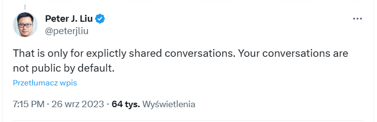 – Dotyczy to tylko rozmów wyraźnie udostępnionych. Twoje rozmowy domyślnie nie są publiczne – napisał na portalu X Peter Liu.
