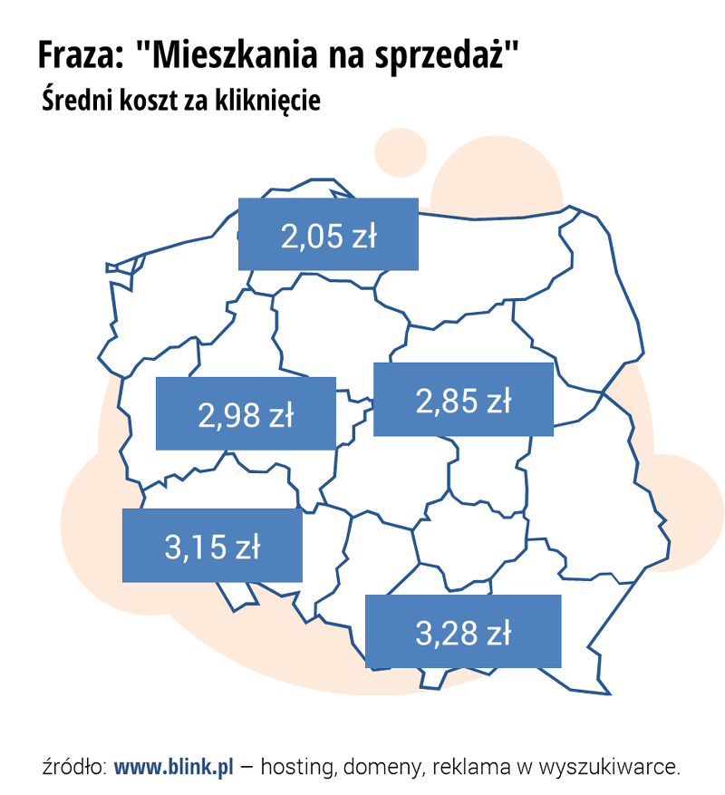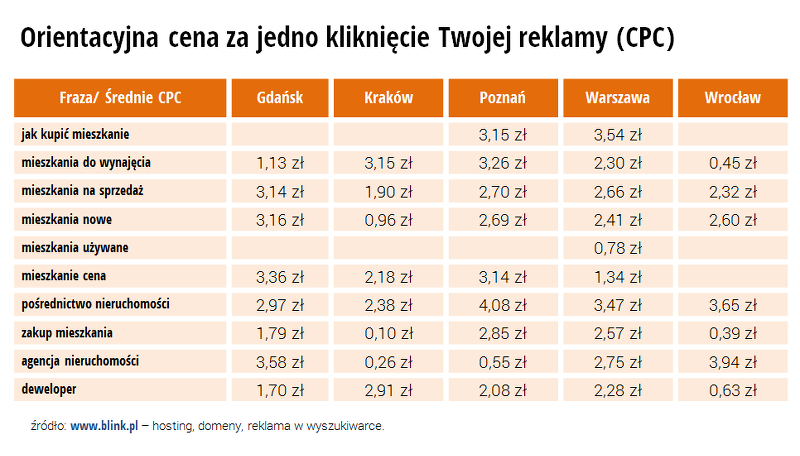 Blink.pl, firma hostingowa i specjalizująca się w kampaniach SEM oraz SEO, zbadała warunki determinujące koszty ponoszone na reklamę w wyszukiwarce Google dla rynku nieruchomości. Pod lupę wzięto 10 typowych dla tej branży słów kluczowych, natomiast sama analiza została przeprowadzona w rozbiciu na duże ośrodki miejskie: Kraków, Poznań, Gdańsk, Wrocław oraz Warszawę.