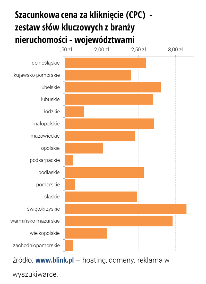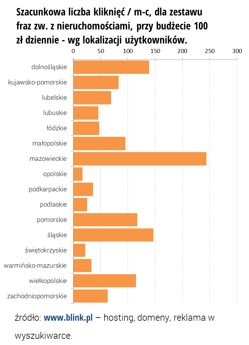 Na koniec Blink.pl sprawdził, które województwa generują największy ruch w branży nieruchomości. Symulowano miesięczną kampanię ogólnopolską z budżetem 100 zł dziennie i sprawdzano wyniki uzyskane w poszczególnych województwach. Jak się okazało, najwięcej, bo blisko 250 kliknięć zebrało województwo mazowieckie (średnia cena za kliknięcie 2,45 zł, budżet całkowity – 600 zł), następnie województwo śląskie – prawie 150 kliknięć oraz dolnośląskie – blisko 140 kliknięć.