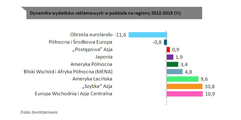 Na rynkach rozwijających się (definiowanych jako kraje poza Ameryką Północną, Europą Zachodnią i Japonią) nie widać sygnałów spowolnienia w sektorze reklamowym, pomimo obaw związanych z krótkoterminowymi perspektywami rozwoju gospodarczego. Zwolnił on miedzy innymi w krajach BRIC (Brazylia, Rosja, Indie i Chiny) wraz z malejącym popytem na eksport i przeniesieniem uwagi międzynarodowych inwestorów w kierunku dojrzałych rynków. Jednak rynki rozwijające się mają młodą populację, rozwijają system edukacji, infrastrukturę, technologie, zwiększają produktywność. Ich wkład w rozwój światowej gospodarki będzie rósł przez najbliższe dekady. Reklamodawcy nie zniechęcili się ostatnimi problemami i inwestują długoterminowo. Dlatego analitycy ZenithOptimedia podnieśli prognozę wzrostu wydatków reklamowych na rynkach rozwijających się w 2013 roku z prognozowanych w czerwcu 7% na 7,6%.