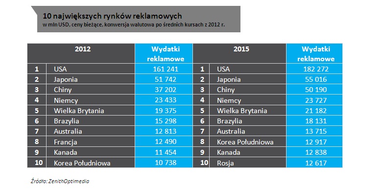 Mimo szybkich wzrostów na rynkach rozwijających się, USA wciąż pozostają rynkiem, który przynosi najwięcej nowych dolarów na globalny rynek reklamy. W latach 2012-2015 USA powinny przynieść 28% z 74 mld USD, o które powiększy się globalny rynek.