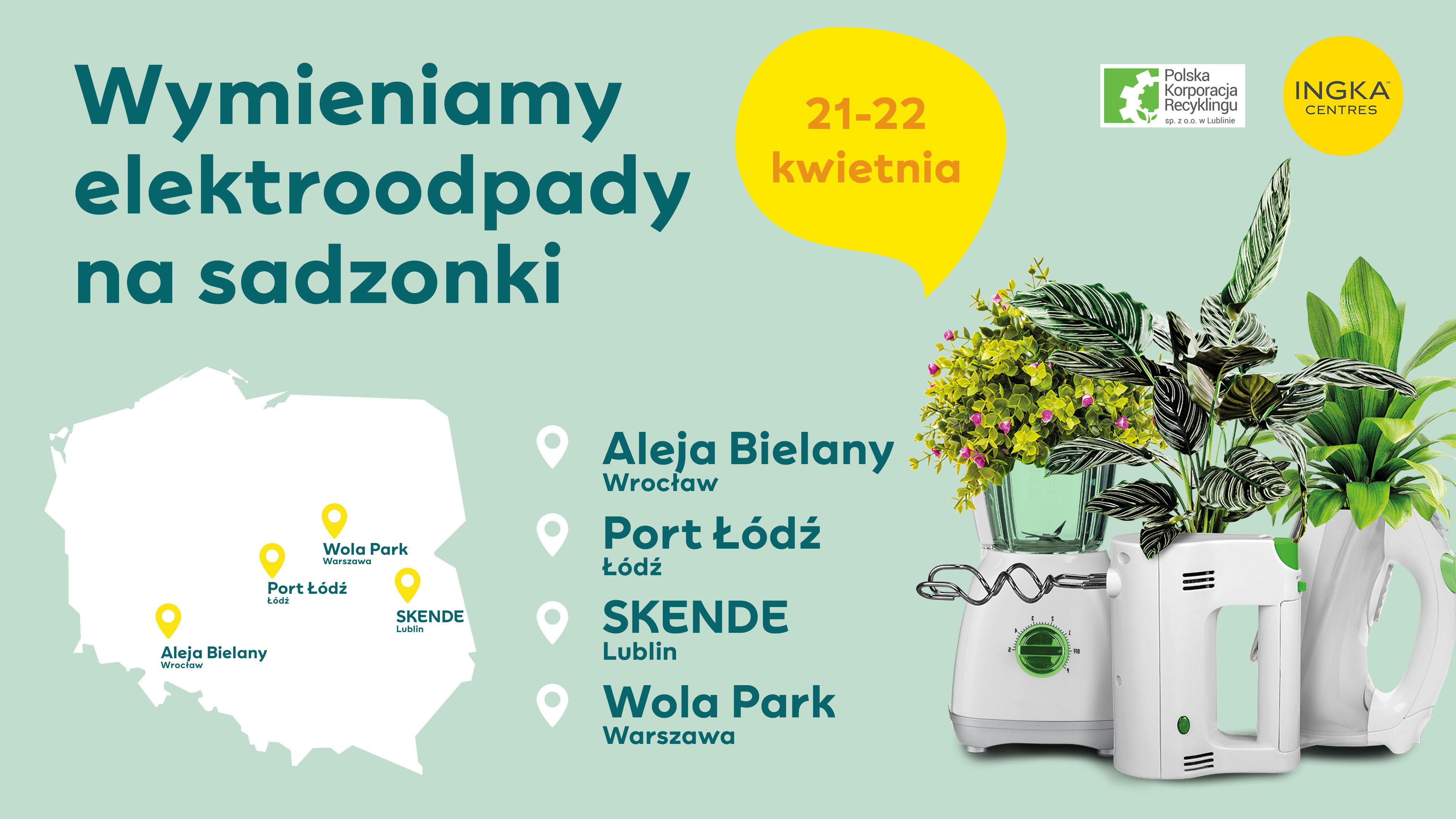 Projekt „Wymień elektroodpady na sadzonki” to cykliczne wydarzenie, które organizowane jest w SKENDE już po raz piąty. W tym roku, aby wzmocnić efekt i świętować Międzynarodowy Dzień Ziemi, centra handlowe połączyły siły i przeprowadziły akcję razem. 21 i 22 kwietnia każda osoba, która przyniosła niechciany lub niesprawny sprzęt AGD lub RTV do mobilnych punktów odbioru, które powstały na terenie centrów handlowych w Lublinie, Warszawie, Łodzi i Wrocławiu, otrzymała kupon, który można było wymienić na sadzonki roślin. Osoby, które oddały drobne elektrośmieci, np. zużyte baterie, także zostały nagrodzone − otrzymały nasiona kwiatów.
