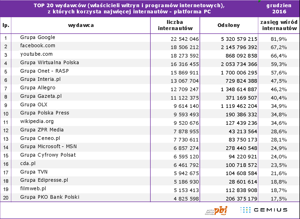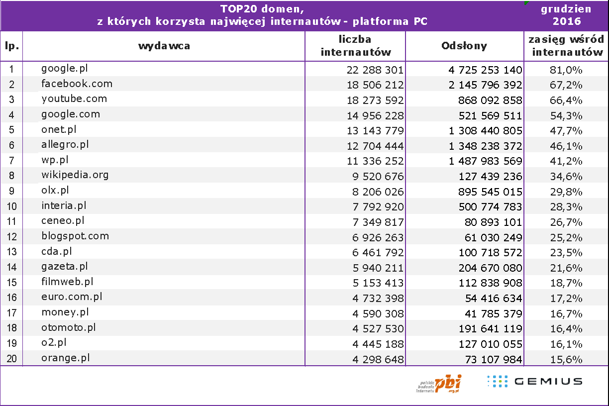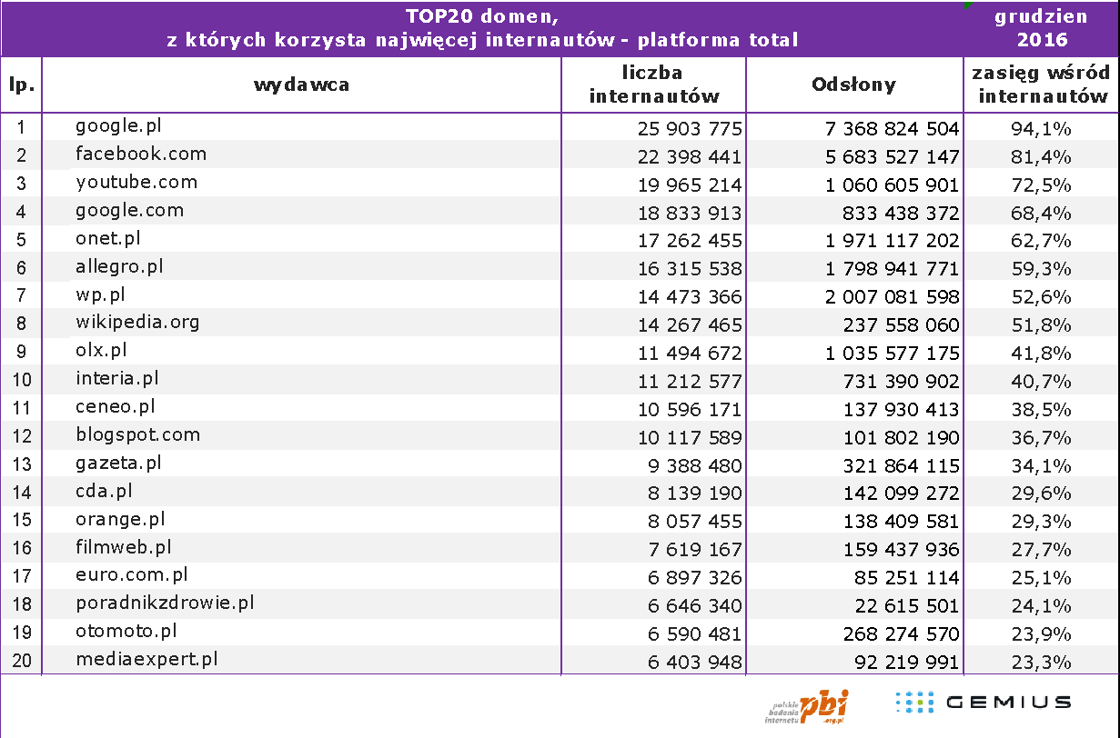 Liczba internautów w Polsce w grudniu 2016 roku wyniosła ogółem 27,5 mln, z czego na platformie PC (komputery osobiste używane w domu oraz w pracy) – 23,5 mln, a na platformie Mobile (smartfony i tablety) 20,9 mln.