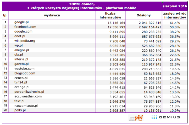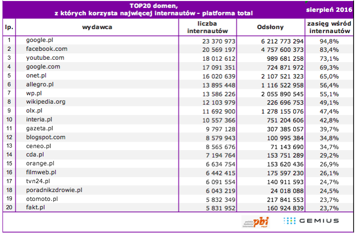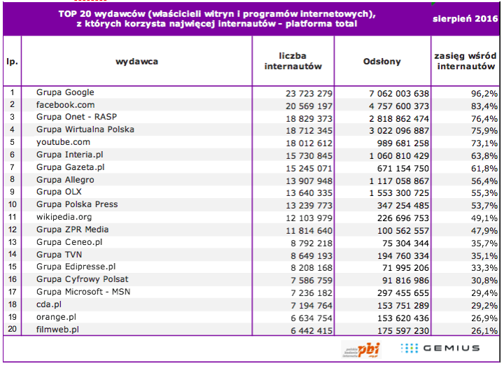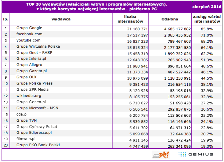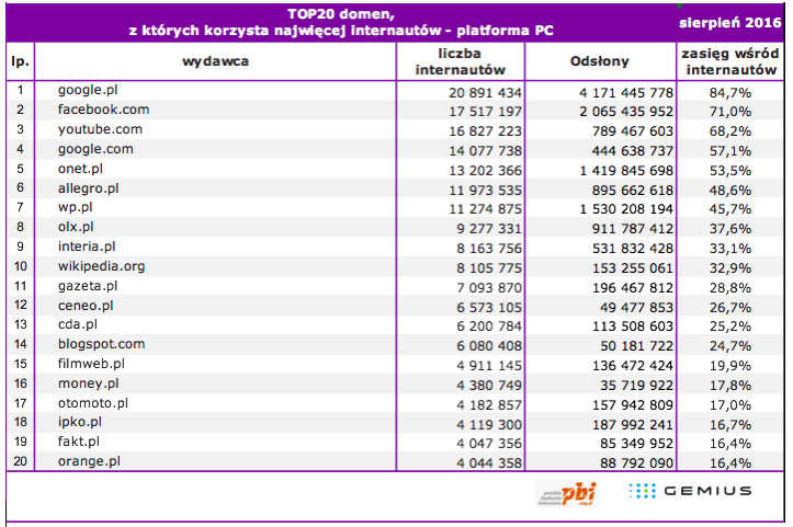 Liczba internautów w Polsce w sierpniu 2016 roku wyniosła ogółem 24,7 mln, z czego na platformie PC (komputery osobiste używane w domu oraz w pracy) – 22,2 mln, a na platformie Mobile (smartfony i tablety) 17,4 mln.