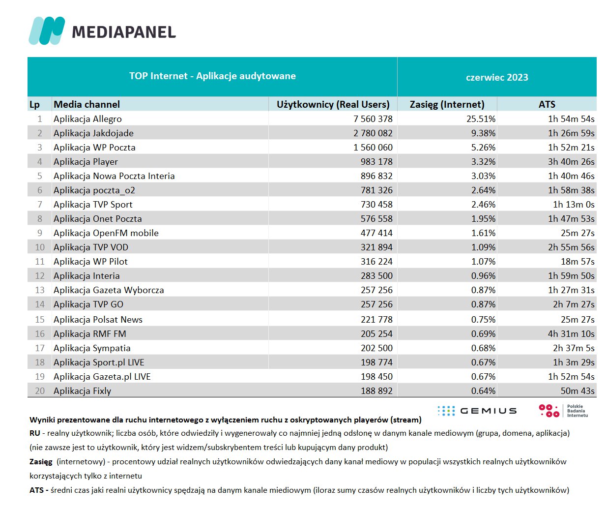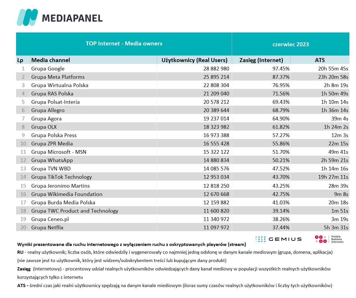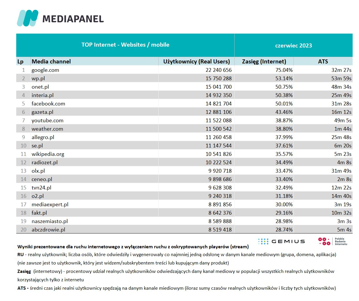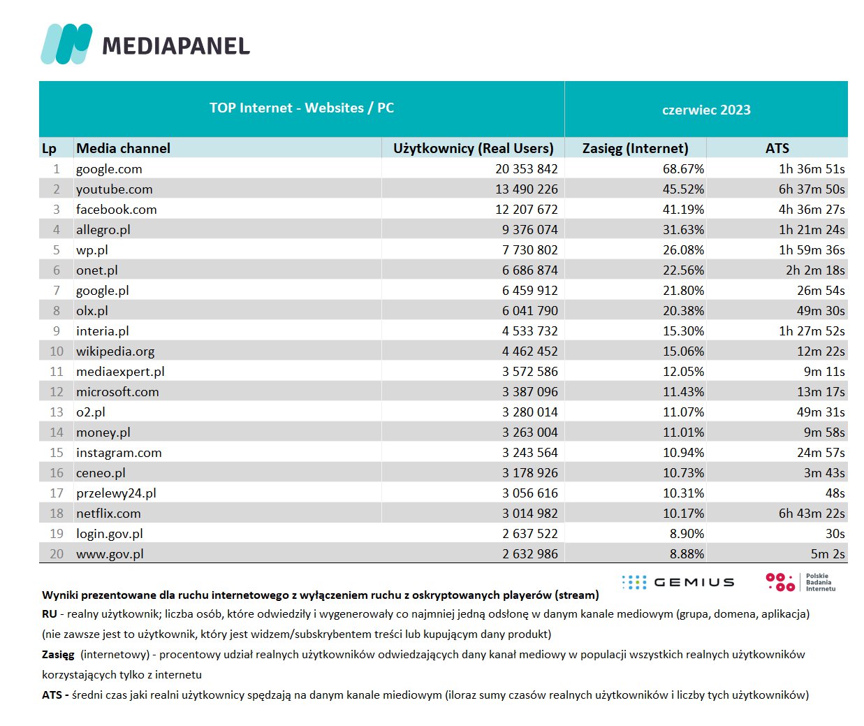 W czerwcu liczba internautów wyniosła 29,6 mln. Średnio dziennie korzystało z tego medium 25,6 mln osób.